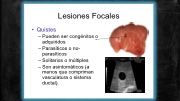 Lesiones Focales • Quistes – Pueden ser congénitos o adquiridos – Parasíticos o no- parasíticos – Solitarios o múltiples – Son asintomáticos (a menos que compriman vasculatura o sistema ductal).