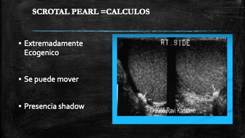 SCROTAL PEARL =CALCULOS ▪ Extremadamente Ecogenico ▪ Se puede mover ▪ Presencia shadow