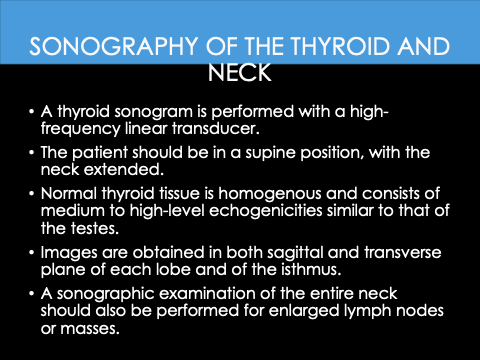• A thyroid sonogram is performed with a high- frequency linear transducer.