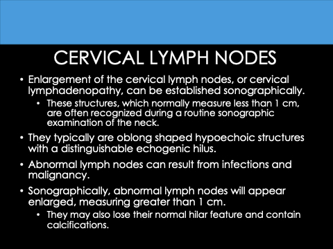 • Sonographically, abnormal lymph nodes will appear enlarged, measuring greater than 1 cm.