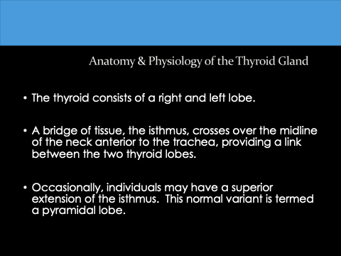 • Occasionally, individuals may have a superior extension of the isthmus. This normal variant is termed a pyramidal lobe.