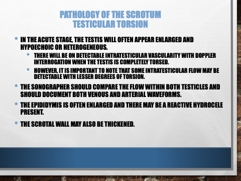 • THERE WILL BE ON DETECTABLE INTRATESTICULAR VASCULARITY WITH DOPPLER INTERROGATION WHEN THE TESTIS IS COMPLETELY TORSED.