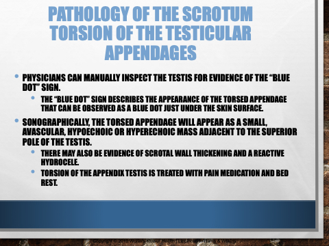 • PHYSICIANS CAN MANUALLY INSPECT THE TESTIS FOR EVIDENCE OF THE “BLUE DOT” SIGN.