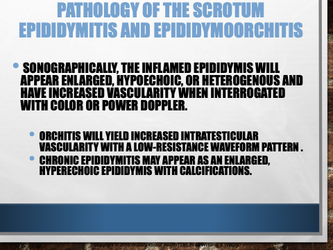 • SONOGRAPHICALLY, THE INFLAMED EPIDIDYMIS WILL APPEAR ENLARGED, HYPOECHOIC, OR HETEROGENOUS AND HAVE INCREASED VASCULARITY WHEN INTERROGATED WITH COLOR OR POWER DOPPLER.