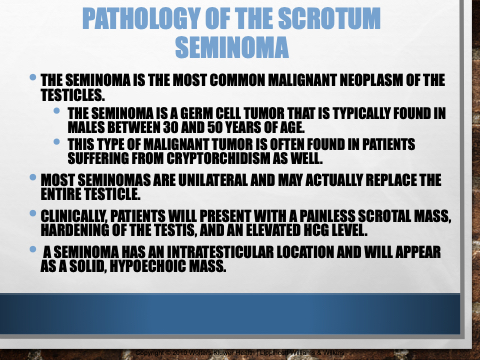 • A SEMINOMA HAS AN INTRATESTICULAR LOCATION AND WILL APPEAR AS A SOLID, HYPOECHOIC MASS.