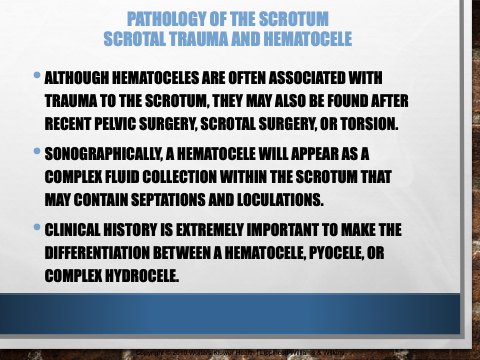 • SONOGRAPHICALLY, A HEMATOCELE WILL APPEAR AS A COMPLEX FLUID COLLECTION WITHIN THE SCROTUM THAT MAY CONTAIN SEPTATIONS AND LOCULATIONS.