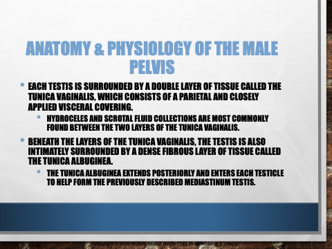• EACH TESTIS IS SURROUNDED BY A DOUBLE LAYER OF TISSUE CALLED THE TUNICA VAGINALIS, WHICH CONSISTS OF A PARIETAL AND CLOSELY APPLIED VISCERAL COVERING.