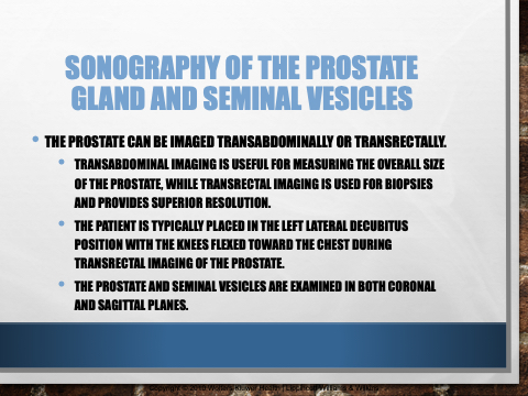 • THE PATIENT IS TYPICALLY PLACED IN THE LEFT LATERAL DECUBITUS POSITION WITH THE KNEES FLEXED TOWARD THE CHEST DURING TRANSRECTAL IMAGING OF THE PROSTATE.