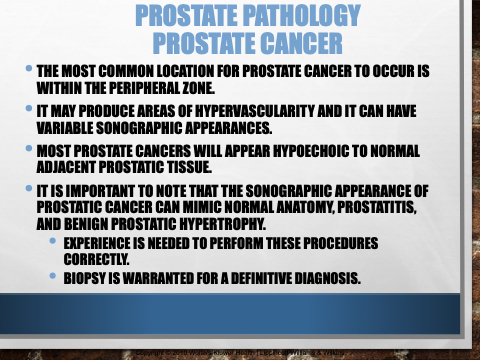 • IT IS IMPORTANT TO NOTE THAT THE SONOGRAPHIC APPEARANCE OF PROSTATIC CANCER CAN MIMIC NORMAL ANATOMY, PROSTATITIS, AND BENIGN PROSTATIC HYPERTROPHY.