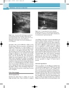 thrombus, and it can be difficult to define on the B-mode image. However, in practice, with advanced transducer technology, it is often possible to see subtle echoes. If the vein is totally occluded in the acute phase, it may appear distended (Fig. 13.8). The thrombus can be free-floating, with large areas being non-adherent to the vein wall. It is usually possible to identify the upper limit of the throm- bosis, and the thrombus tip often demonstrates slightly increased echogenicity (Fig. 13.9). The tip is much easier to identify if it extends to the popliteal or femoral veins. Prudence should be exercised with transducer compression if free-floating thrombus is present, to avoid dislodging the thrombus. Smaller areas of nonocclusive thrombus may not cause the vein to distend, but they can be demonstrated by incomplete collapse of the vein during compression. Older thrombus, beyond two weeks in age, becomes more echogenic.