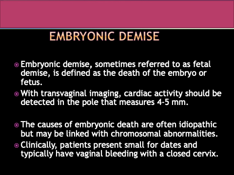 Embryonic demise, sometimes referred to as fetal demise, is defined as the death of the embryo or fetus.