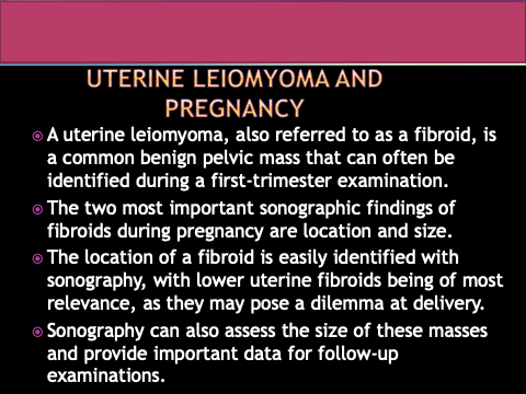 The location of a fibroid is easily identified with sonography, with lower uterine fibroids being of most relevance, as they may pose a dilemma at delivery.