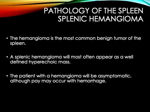 • The hemangioma is the most common benign tumor of the spleen.