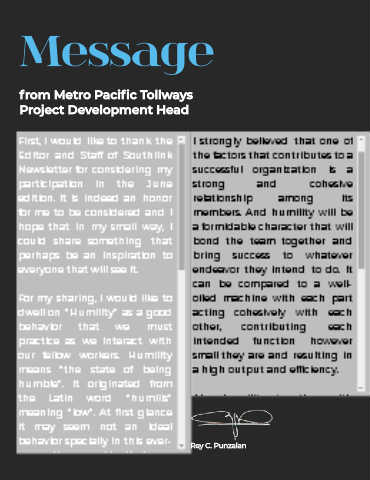 Message from Metro Pacific Tollways Project Development Head Rey C. Punzalan