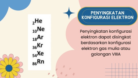 PENYINGKATAN KONFIGURASI ELEKTRON Penyingkatan konfigurasi elektron dapat disingkat berdasarkan konfigurasi elektron gas mulia atau golongan VIIIA
