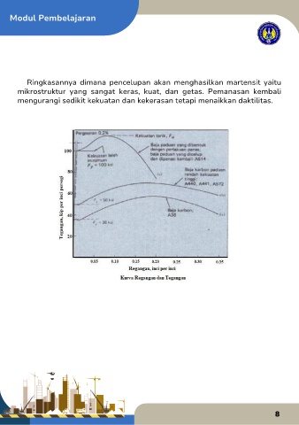 Modul Pembelajaran Ringkasannya dimana pencelupan akan menghasilkan martensit yaitu mikrostruktur yang sangat keras, kuat, dan getas. Pemanasan kembali mengurangi sedikit kekuatan dan kekerasan tetapi menaikkan daktilitas. 8