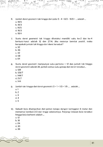 6. Jumlah deret geometri tak hingga dari pola: 6 - 4 + 8/3 - 16/9 + ... adalah ...