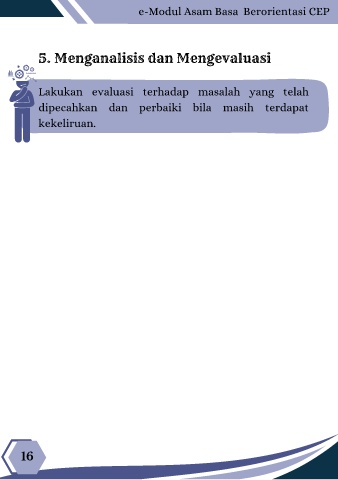 e-Modul Asam Basa Berorientasi CEP 5. Menganalisis dan Mengevaluasi Lakukan evaluasi terhadap masalah yang telah dipecahkan dan perbaiki bila masih terdapat kekeliruan. 16