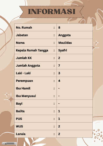 INFORMASI No. Rumah : 8 Jabatan : Anggota Nama : Maulidas Kepala Rumah Tangga : Syafri Jumlah KK : 2 Jumlah Anggota : 7 Laki - Laki : 3 Perempuan : 4 Ibu Hamil : - Ibu Menyusui : - Bayi : - Balita : 1 PUS : 1 WUS : 2 Lansia : 2