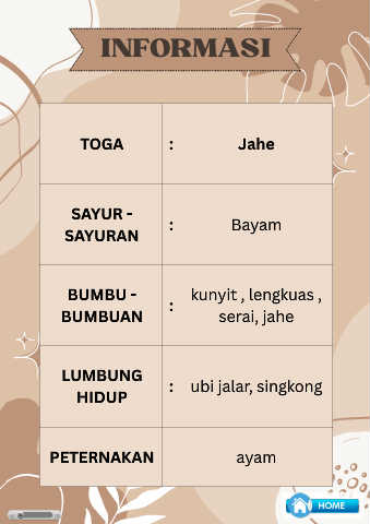 INFORMASI TOGA : Jahe SAYUR - SAYURAN : Bayam BUMBU - kunyit , lengkuas , BUMBUAN : serai, jahe LUMBUNG : ubi jalar, singkong HIDUP PETERNAKAN ayam