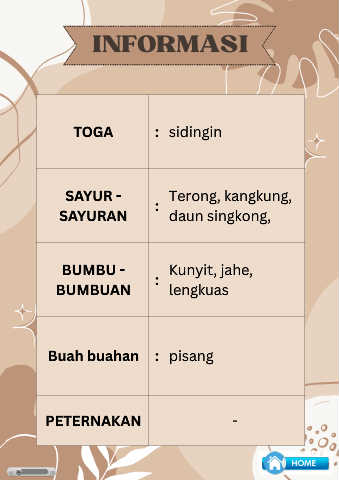 INFORMASI TOGA : sidingin SAYUR - Terong, kangkung, SAYURAN : daun singkong, BUMBU - Kunyit, jahe, BUMBUAN : lengkuas Buah buahan : pisang PETERNAKAN -