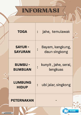 INFORMASI TOGA : jahe, temulawak SAYUR - Bayam, kangkung, SAYURAN : daun singkong BUMBU - kunyit , jahe, serai, BUMBUAN : lengkuas LUMBUNG : ubi jalar, singkong HIDUP PETERNAKAN -