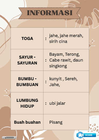 INFORMASI jahe, jahe merah, TOGA : sirih cina Bayam, Terong, SAYUR - SAYURAN : Cabe rawit, daun singkong BUMBU - kunyit , Sereh, BUMBUAN : Jahe, LUMBUNG : ubi jalar HIDUP Buah buahan Pisang