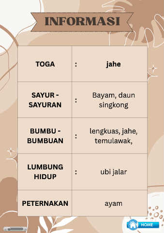 INFORMASI TOGA : jahe SAYUR - Bayam, daun SAYURAN : singkong BUMBU - lengkuas, jahe, BUMBUAN : temulawak, LUMBUNG : ubi jalar HIDUP PETERNAKAN ayam