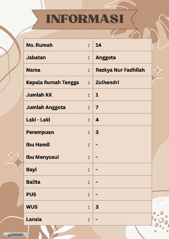 INFORMASI No. Rumah : 14 Jabatan : Anggota Nama : Rezkya Nur Fadhilah Kepala Rumah Tangga : Zulhendri Jumlah KK : 1 Jumlah Anggota : 7 Laki - Laki : 4 Perempuan : 3 Ibu Hamil : - Ibu Menyusui : - Bayi : - Balita : - PUS : - WUS : 3 Lansia : -