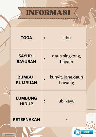 INFORMASI TOGA : jahe SAYUR - daun singkong, SAYURAN : bayam BUMBU - kunyit, jahe,daun BUMBUAN : bawang LUMBUNG : ubi kayu HIDUP PETERNAKAN -