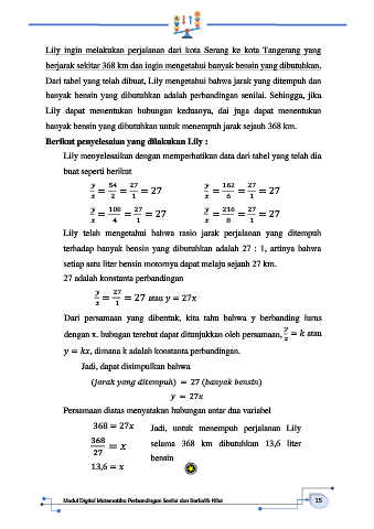 368 = 27          Jadi,  untuk  menempuh  perjalanan  Lily