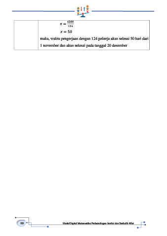 = 6200 124 = 50 maka, waktu pengerjaan dengan 124 pekerja akan selesai 50 hari dari 1 november dan akan selesai pada tanggal 20 desember 60 Modul Digital Matematika Perbandingan Senilai dan Berbalik Nilai