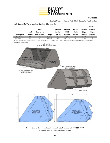 All high capacity telehandler buckets are fabricated with ¼” end plates, back & ¼” AR400 formed bottom with a ¾” x 6” bevelled cutting