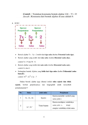 Dalam bentuk aljabar juga dikenal istilah suku sejenis dan tidak