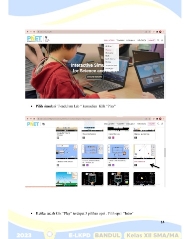 Pilih simulasi “Pendulum Lab “ kemudian Klik “Play” Ketika sudah klik “Play” terdapat 3 pilihan opsi . Pilih opsi “Intro” 14