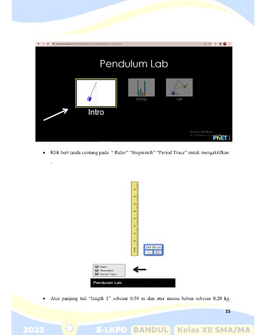 Klik beri tanda centang pada “ Ruler” “Stopwatch” “Period Trace” untuk mengaktifkan . Atur panjang tali “length 1” sebesar 0,50 m dan atur massa beban sebesar 0,20 kg. 15