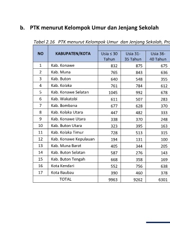 Tabel 2.16 PTK menurut Kelompok Umur dan Jenjang Sekolah, Provinsi Sulawesi Tenggara