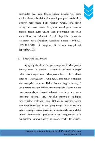 berkualitas bagi para lansia. Sesuai dengan visi panti