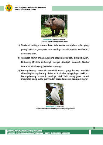 c) Terdapat hewan endemik, seperti badak bercula satu di Ujung Kulon,