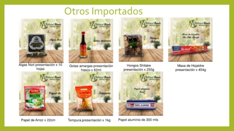 Otros Importados Algas Nori presentación x 10 Gotas amargas presentación Hongos Shitake Masa de Hojaldre hojas frasco x 62ml presentación x 250g presentación x 454g Papel de Arroz x 22cm Tempura presentación x 1kg Papel aluminio de 300 mts