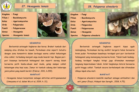 • Hexagonia tenuis berpotensi sebagai aktivitas antitrypanasomal • Polyporus alveolaris memiliki manfaat sebagai antibakteri dan