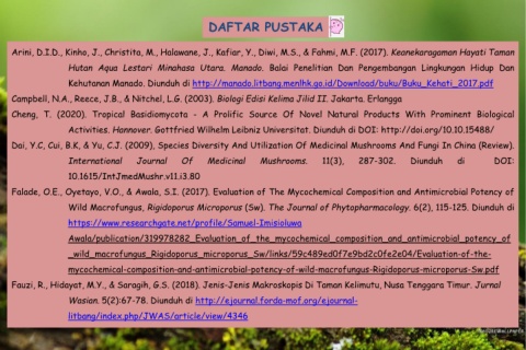 Fauzi, R., Hidayat, M.Y., & Saragih, G.S. (2018). Jenis-Jenis Makroskopis Di Taman Kelimutu, Nusa Tenggara Timur. Jurnal