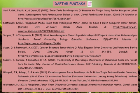 Sari, P.H.M., Nazib, K., & Dayat, E. (2016). Jenis-Jenis Basidiomycota Di Kawasan Air Terjun Curug Pandan Kabupaten Lahat