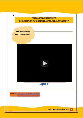 A. VIDEO ANIMASI BERNYANYI BAGIAN TUBUH YANG BOLEH DAN TIDAK BOLEH DISENTUH AYO PERHATIKAN AKU TEMAN-TEMAN!! SUMBER https://youtu.be/878HzqGwWp8 FLIPBOOK PERSONAL SAFETY SKILL 6