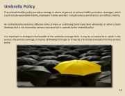 The umbrella liability policy provides coverage in excess of general or primary liability and other coverages, which could include automobile liability, employers’ liability (workers’ compensa on), and directors and o cers liability.