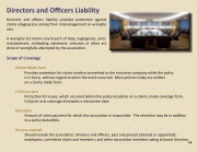 Directors and o cers liability provides protec on against claims alleging loss arising from mismanagement or wrongful acts.