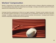Coverage should be considered even if there are no regular employees. Protec on may be needed in the event the associa on employs casual labor or if the associa on hires an independent contractor who had no insurance coverage. In addi on, coverage may be desired for board members and volunteers. Coverage should include a voluntary compensa on endorsement for those exposures.