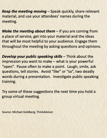a a a a a a a a a a a a place of service get into your your material and the the the the ideas that will be most helpful to to your your audience Engage them throughout the the meeting by asking questions and opinions Develop your your public speaking skills – – Think about the impression you you you want to to make make – – what is your your powerful “open” Pause often to to to make make a a a a a a a a a point Laugh smile ask questions tell stories Avoid “like” or or or “so” two deadly words during a a a a a a presentation Investigate public speaking training Try some of these suggestions the the next time you hold a a group virtual meeting Source: Michael Goldberg ThinkAdvisor