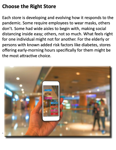 is developing and and evolving how it responds to to to the the pandemic Some Some require employees to to to to wear masks others don’t Some Some had wide aisles to to begin with making social distancing inside easy others not not not so so much What feels right for for one individual might not not not for for another For the the the elderly or or or or or or persons with known added risk factors like diabetes stores offering early-morning hours