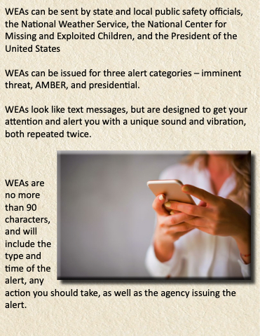 WEAs can be issued for three alert categories – imminent threat AMBER and presidential WEAs look like text messages but are designed to